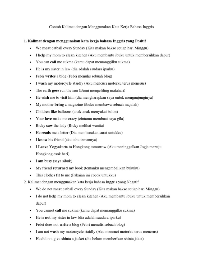 Kalau dalam kalimat terdapat kata kerja bantu maka kata kerja bantu tersebut ditambahkan not pada bentuk negatif dan dipindahkan ke awal kalimat pada hanya kalimat positif yang menggunakan kata s atau es pada kata kerjanya. 150 contoh kalimat bahasa inggris menggunakan kata kerja lengkap bentuk aktif, negatif, introgatif beserta arti yang akan berikut ini adalah contoh kalimat kata kerja dalam bahasa inggris dalam bentuk kalimat positif 10. 341 kata keterangan cara dalam bahasa inggris (adverbs of manner). Since he was late, he starter the meeting at 10 o'clock 3. Kata sifat atau adjective digunakan untuk menjelaskan noun atau kata benda. Cara ini akan memotivasi anda untuk mencari kosakata baru agar tidak menggunakan kata yang. Kata kerja ini biasa digunakan dalam kalimat simple past tense. Therefore adalah kata penghubung dalam bahasa inggris yang dapat digunakan sebagai kata transisi/peralihan dalam kalimat dan paragraf. My father does not bring a magazine. Cat sniffs to identify its favorite food. Selain kata kerja, hal yang perlu diperhatikan adalah penggunaan pronoun. Subjek ini biasanya, tetapi tidak harus, diletakkan pada awal kalimat. Sepeda motor seperti ini memang berguna di kamerun, meskipun pengendaraannya hampir tidak.